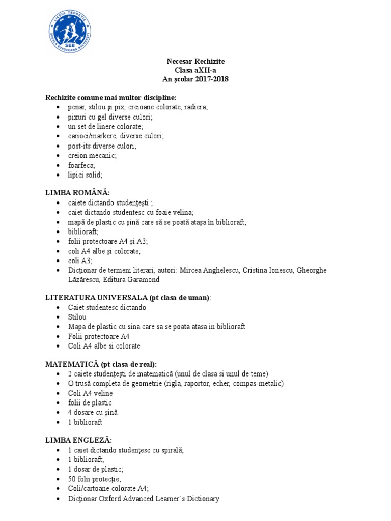 Clasa A Iv A C Liceul Teoretic Miron Costin Pascani Lista Rechizite Clasa A Ii A