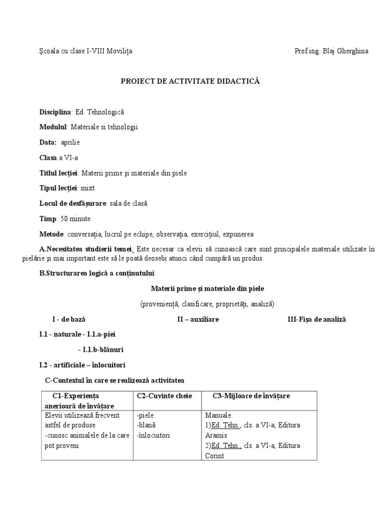 Prime Si Materiale Referat La Tehnologie Clasa A Vi A