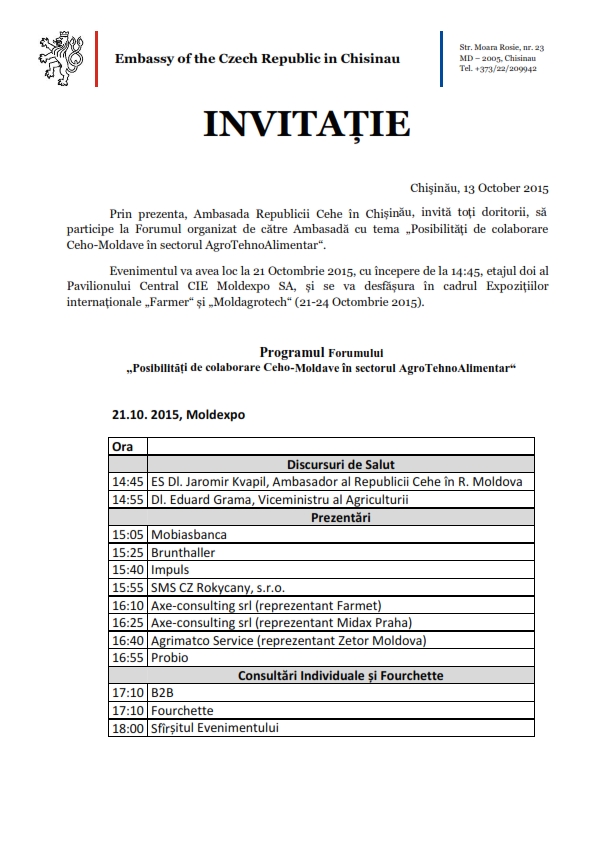 Invitatia La Forumul Organizat De Către Ambasadă Cu Tema Posibilități De Colaborare Ceho Moldave In Sectorul Agrotehnoalimentara œ Noutăți Agenția De Dezvoltare Regională Sud