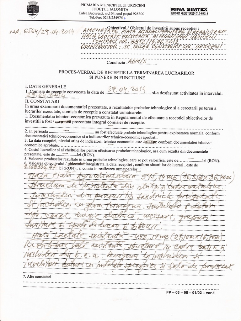 Proces Verbal De Receptie La Terminarea Lucrarilor Hala Pdf